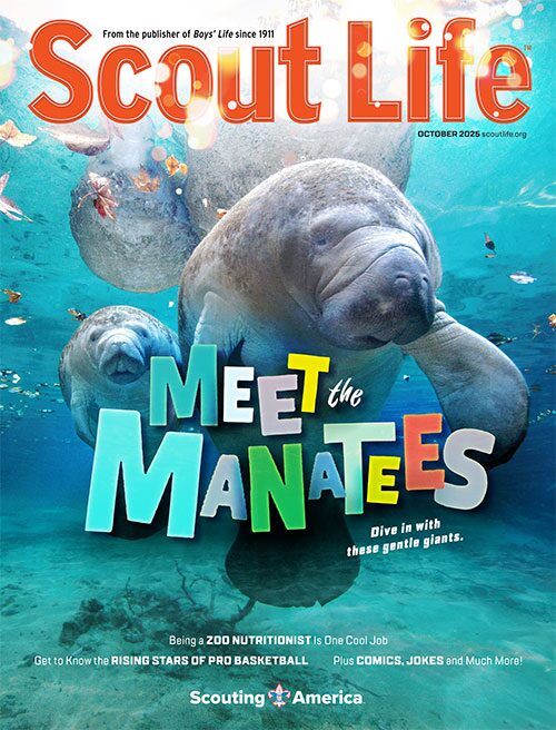 The October 2025 issue of Scout Life magazine is out now and features of my Halloween-themed cartoons–a real banger (literally)!