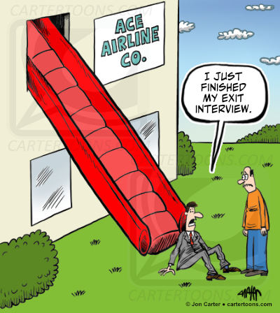 A man slides out of an airline company building on a giant inflatable airplane slide for his exit interview with the company.